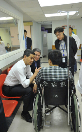 特首梁振英(左一)到医院探望伤者。旁为医管局主席胡定旭、站立者为食物及卫生局局长高永文\资料图片