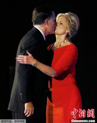 2012年美国大选结果于当地时间7日凌晨出炉。奥巴马目前已经获得274张选举人票,成功连任。图为在波士顿,罗姆尼发表完败选演讲后,与妻子亲吻。
