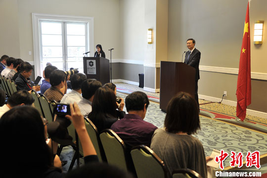 当地时间6月8日,中国国务委员杨洁篪在美国加州印第安纳维尔斯凯悦酒店举行中外记者会,谈习近平主席与奥巴马总统安纳伯格庄园会晤成果。中新社发 毛建军 摄