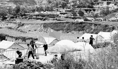鲜红的党旗飘扬在岷县震区临时安置点上。连日来,在社会各界的援助下,岷县漳县震区群众生活基本得到保障。本报记者 吕亚龙