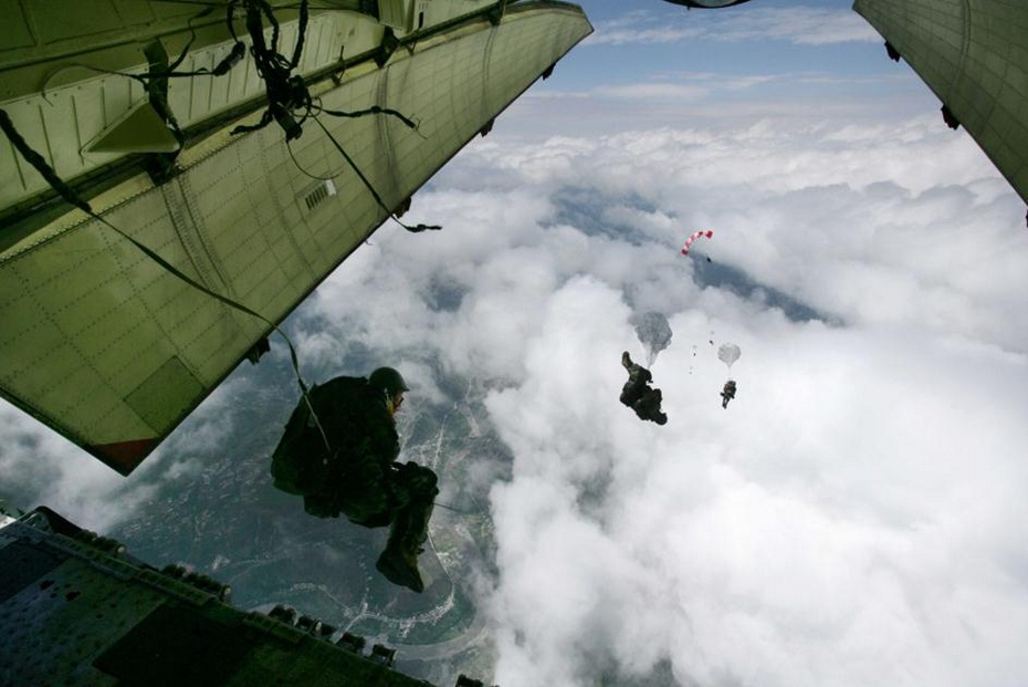 2008年5月14日,15名空降兵中从地震灾区四川茂县上空4999米的高空奋不顾身地跳下。据总参作战部统计,自2008年汶川特大地震发生以来,全军遂行非战争军事行动任务先后出动兵力已达250万人次以上,组织民兵预备役近800万人次,派出飞机近7000架次。军队和武警部队始终听党指挥、服务人民、英勇善战,在应对重大突发事件中,不畏艰险,勇挑重担,不怕疲劳,连续作战,圆满完成了党和人民赋予的任务。新华社发