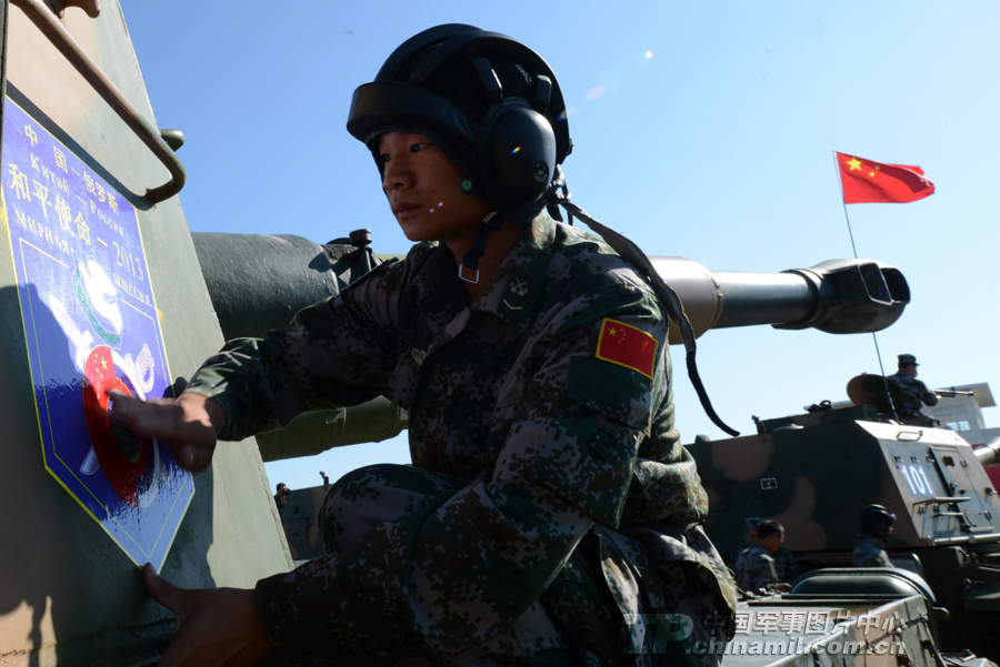 一名战士给将要出征的战车贴上演习图标