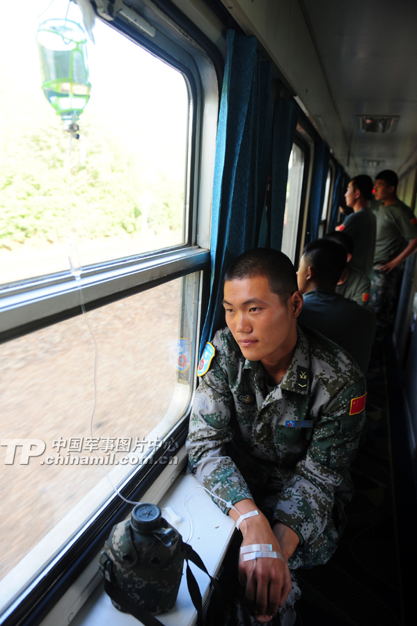 一名战士在投送列车上打点滴,生病期间他没落下一次训练。盖旭辉 摄