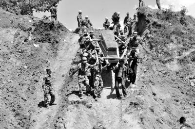 22日,解放军官兵帮助永光村受灾群众将棺材抬到下葬地点。