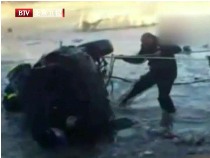 轿车侧滑坠入冰河 百人喊号子合力救援
