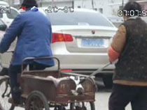 老人骑三轮 老伴用棍儿推