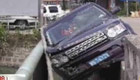 桥头窜出两条小狗 路虎被卡护栏
