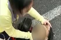 女孩跪地施救车祸伤者