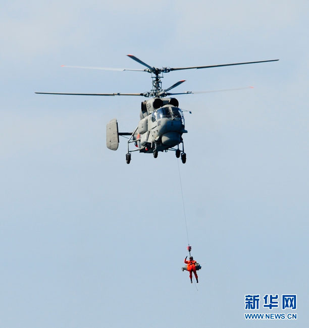 搜救直升机营救“落水人员”。孙利 摄 图片来源:新华网