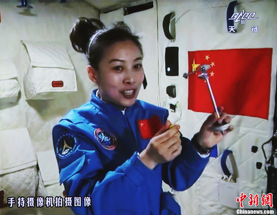 6月20日10时许,神舟十号航天员在天宫一号开展基础物理实验,为青少年进行中国首次太空授课。图为王亚平讲授太空失重提供条件下的单摆演示。中新社发 秦宪安 摄