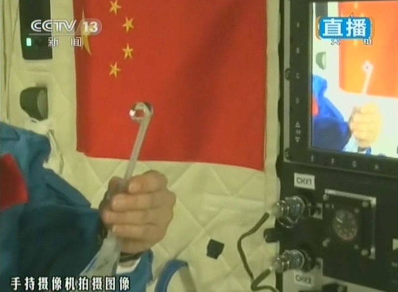 6月20日上午10时许,神舟十号航天员进行中国首次太空授课,女航天员王亚平担任主讲,成为中国首位“太空教师”。(视频截图)