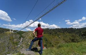 当地时间2021年5月2日,葡萄牙阿罗卡,世界最长人行悬索桥“516 Arouca”向民众开放。据报道,这座桥全长516米,位于河流上方175米,桥面由金属构建打造,能直接透过桥面看到峡谷。 图片来源:ICphoto