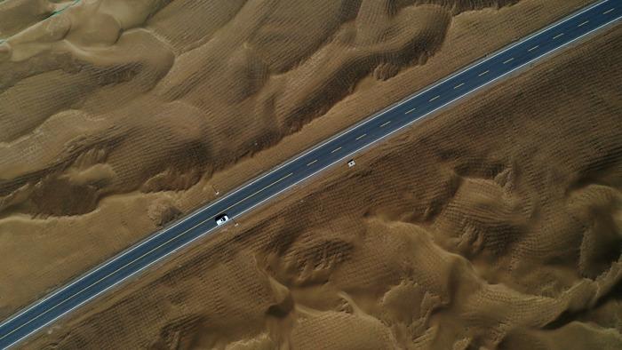 航拍尉且沙漠公路风光